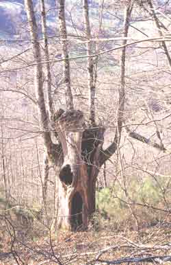 Árbol hueco (carocha) característico de souto degradado en Fonsagrada (Lugo). Existen numerosos clones híbridos de castaño resistentes a la enfermedad de la tinta y cada uno de estos clones corresponde por tanto a un individuo con determinadas características genéticas que regulan en parte su aptitud como productor de madera, por lo que cada variedad tiene una madera de calidad diferente.