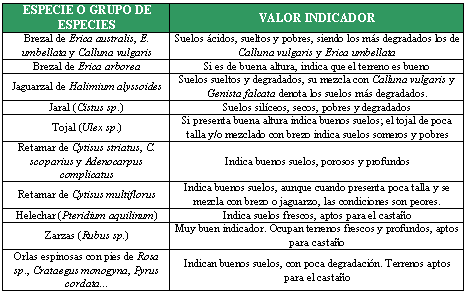 La vegetación natural de una parcela es un indicador muy valioso para saber si sus condiciones son aptas para el castaño, ya que esa vegetación es el resultado de la calidad del suelo, del clima y de otras condiciones naturales, indicando la existencia de hechos consumados que han posibilitado la existencia de esa vegetación, y resultando muchas veces más esclarecedor que un análisis de suelo (ver Tabla 3).