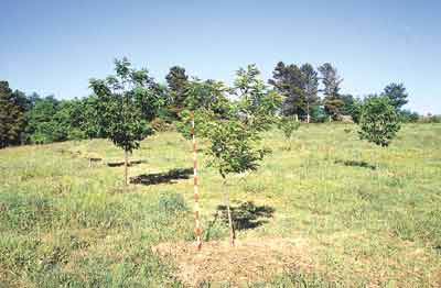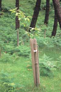 Plantación de castaños sometida a fuerte competencia herbácea. El empleo de protectores individuales se puede plantear tan sólo en pequeñas repoblaciones, o en las realizadas a grandes espaciamientos debido al elevado coste que supone. La altura del protector individual depende de la especie contra la que se quiera proteger la planta, siendo como mínimo de 0,60 m para conejos, 0,75 m para liebre, 1,2 m para corzo y oveja, 1,5 m para ganado vacuno y 1,80 m para ciervo. La gama de protectores individuales así como su precio son muy variados, pudiéndose emplear tubos cinegéticos, tubos con efecto invernadero y mallas plásticas o metálicas grapadas y entutoradas parcialmente. La disposición de tutores robustos formados por piquetas de madera tratada es muy importante, ya que de lo contrario el protector puede caer y tumbar consigo a la planta.