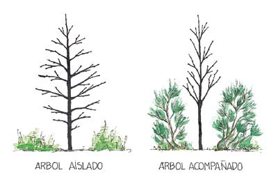 Comparación de la forma de un árbol aislado frente a otro acompañado lateralmente por xestas. En plantaciones de castaño realizadas empleando plantas pequeñas debe procurarse no desbrozar en períodos de máximo calor plantas que han estado mantenidas a la sombra, porque el castaño soporta mal estas puestas en luz drásticas y puede secarse o sufrir quemaduras.