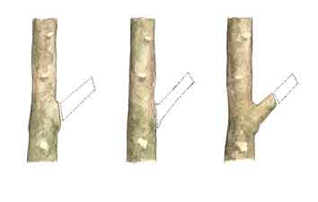 A partir de una planta de frondosas de mala forma (O) se indica la forma inadecuada de tallar (A) y la correcta (B) Las tallas son operaciones costosas, pero absolutamente necesarias cuando se planta a poca densidad. No debe pretenderse tallar de forma pormenorizada todos los árboles del monte, sino más bien aquellos de mejor calidad. Es frecuente en frondosas observar árboles podados muy precozmente y que en cambio no son tallados o lo son demasiado tarde.