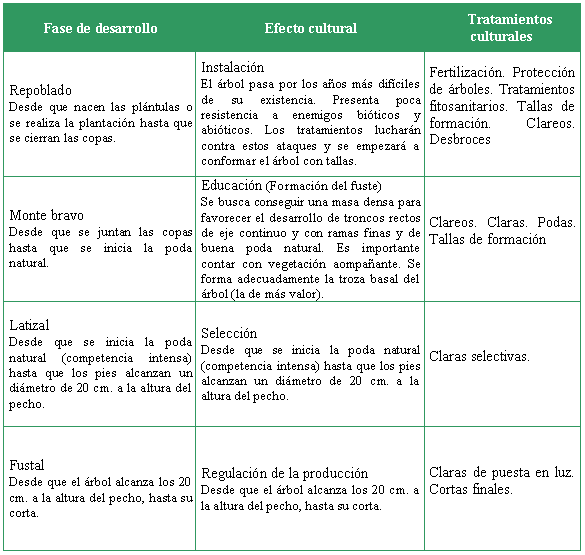 Los primeros años de vida son aquellos en los que el fuste se desarrolla en altura, siendo el objetivo principal la consecución de un número suficiente de árboles con forma forestal aceptable. A medida que crecen en altura y diámetro, las ramas inferiores, al ser sombreadas, mueren y caen, consiguiéndose la poda natural, que es buena en casi todas estas especies.
