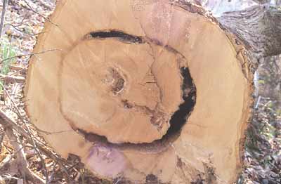 Corona de pudrición en una troza de castaño. Los ácidos tánicos provocan una posterior dificultad a la hora de colorear la madera.