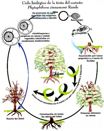 El micelio del hongo puede permanecer saprófito en el suelo sobre materia orgánica y ser transportado con el mismo a otras zonas. Si las condiciones, de humedad sobre todo, le son favorables (Phytophthora cinnamomi necesita agua líquida en el suelo para desarrollarse) germina y produce esporangios que liberan zoosporas móviles con dos flagelos que son atraídas por quimio y electrotactismo hacia las raíces donde penetran directamente o por zonas lesionadas.