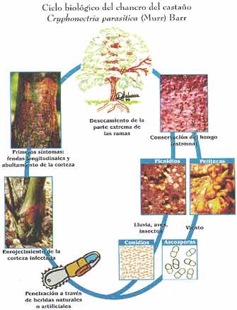 El chancro del castaño es una enfermedad fúngica causada por el ascomiceto Cryphonectria parasitica (Murr.) Barr. Este hongo, patógeno de heridas, es incapaz de invadir tejidos corticales sanos, penetrando en el huésped a través de heridas de distinta naturaleza (poda, grietas, cicatrices, etc.).